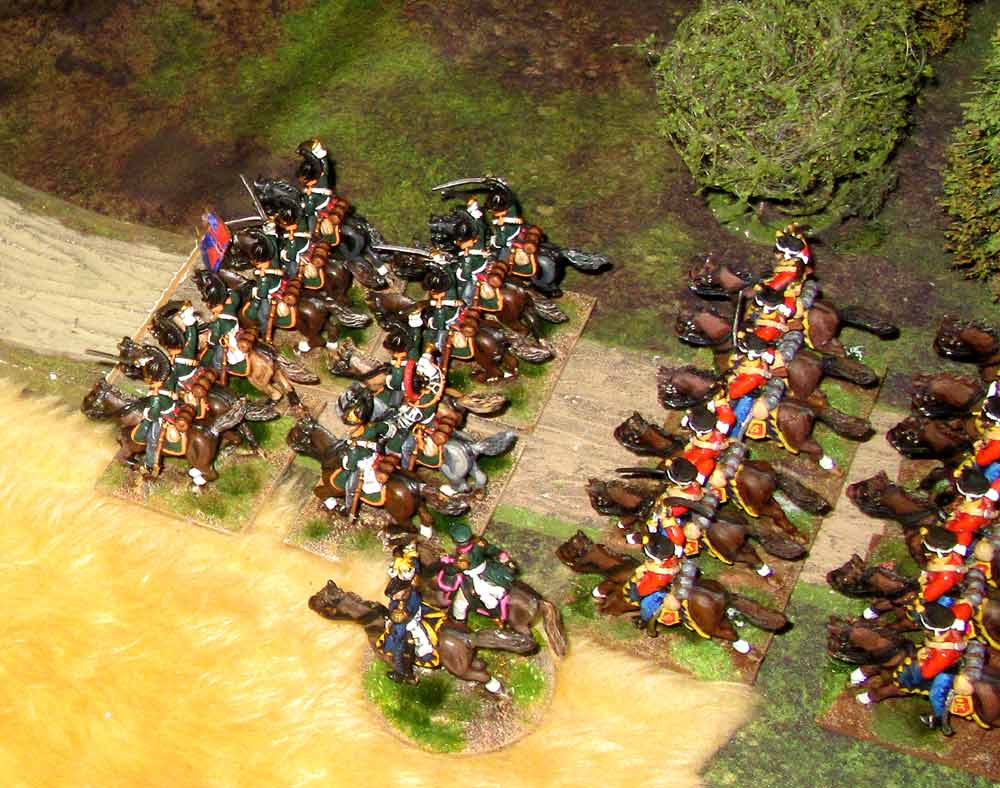 Sean then tried something different. He his Cossacks forward to outflank the French right. Fortunately I’d already brought up the French 7th Hussars as backup. I charged with them, and surprisingly the Cossacks didn’t run. but fought the hussars instead. In the melee we each rolled four dice, and a 4-6 is a hit. I also I had a +2 modifier and the Cossacks had a -1. Easy, right? Oh no…!