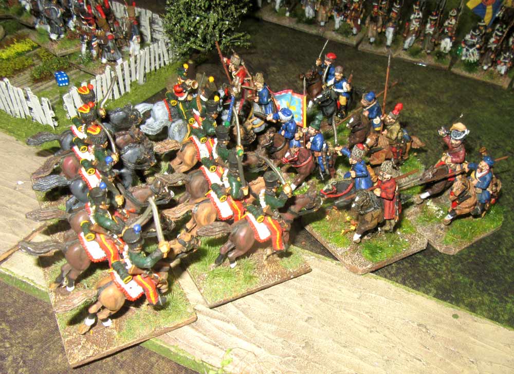 Sean then tried something different. He his Cossacks forward to outflank the French right. Fortunately I’d already brought up the French 7th Hussars as backup. I charged with them, and surprisingly the Cossacks didn’t run. but fought the hussars instead. In the melee we each rolled four dice, and a 4-6 is a hit. I also I had a +2 modifier and the Cossacks had a -1. Easy, right? Oh no…!