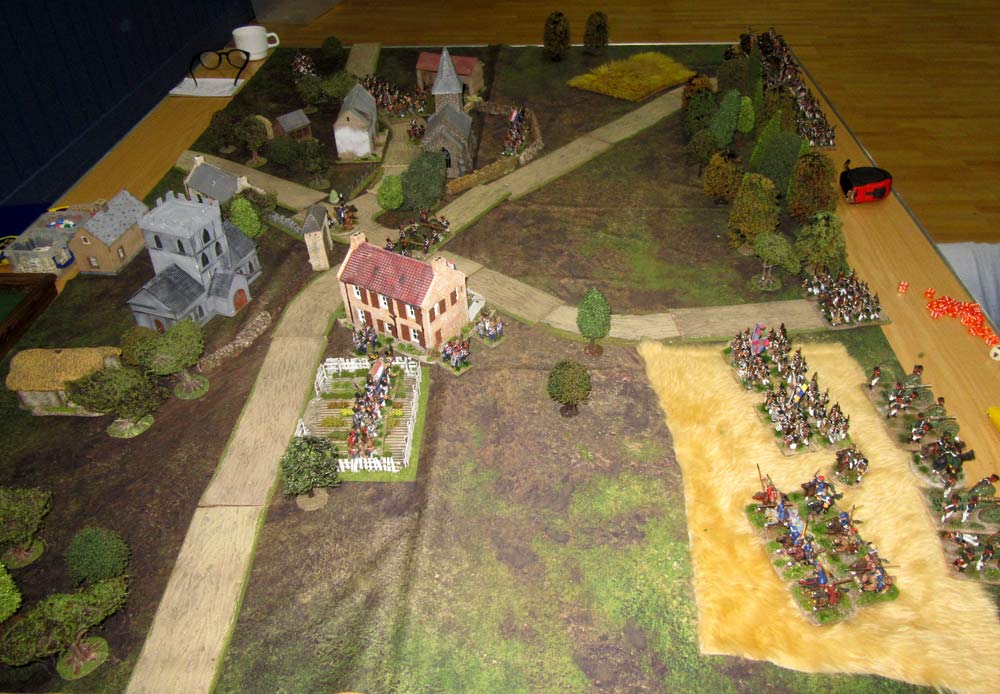 With just Sean and I this week, we wanted a small, easily playable game. We found the perfect set-up in Charles Grant’s new scenario book, published by Partizan Press. One of its scenarios is called The Two Churches, and involves an assault on a village – with two churches of course – which propped up the flank if the defender’s hold on a bigger town or city a little way off the table. As that fitted the bill, that’s what we did, with a few minor changes.