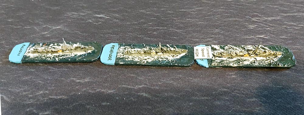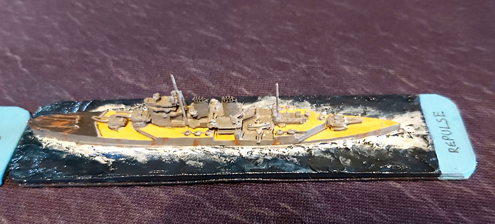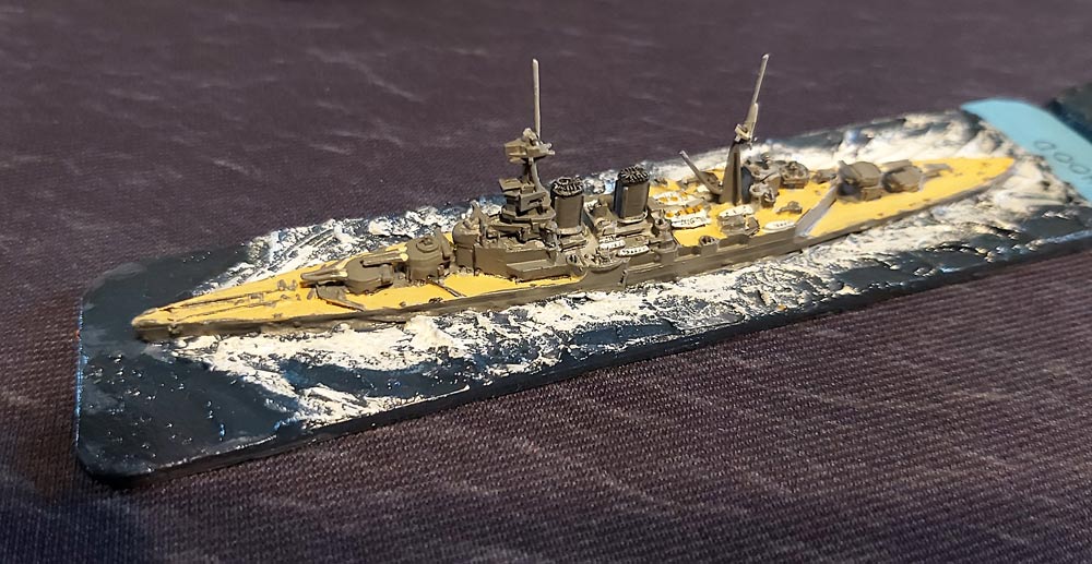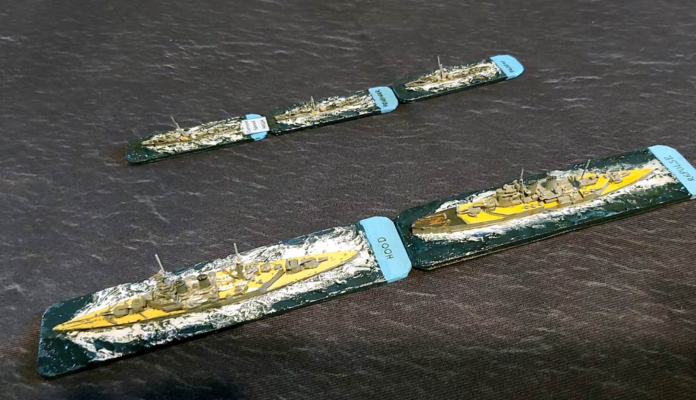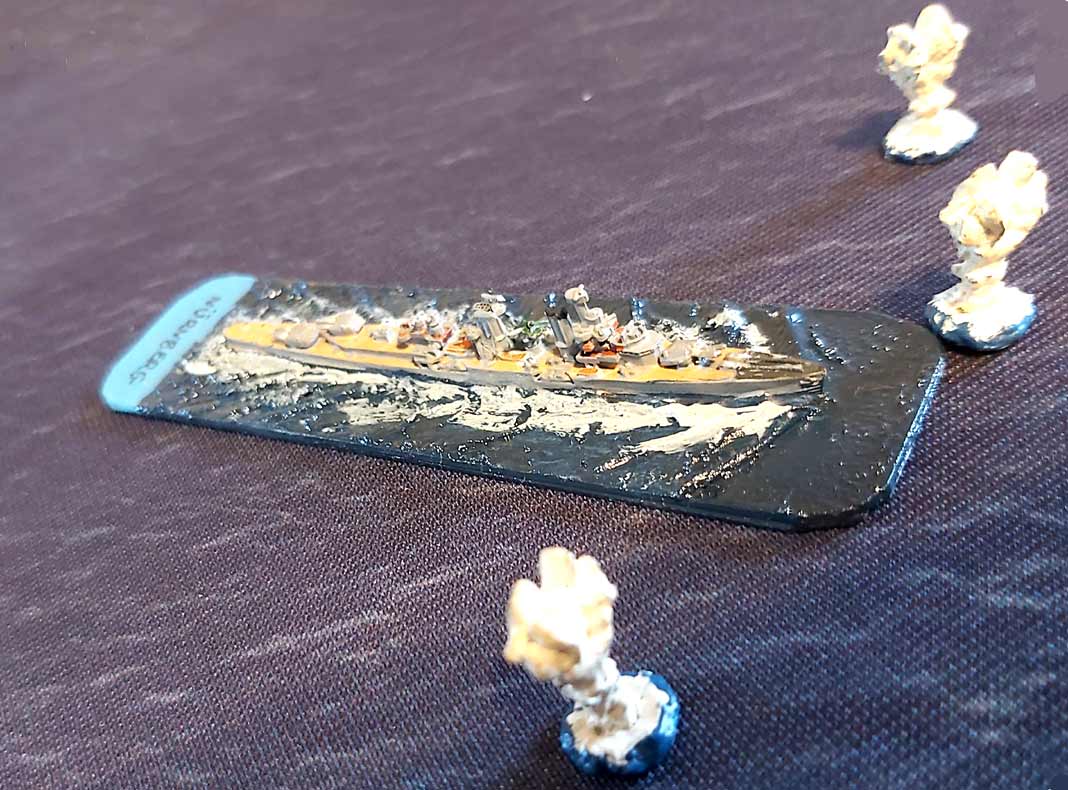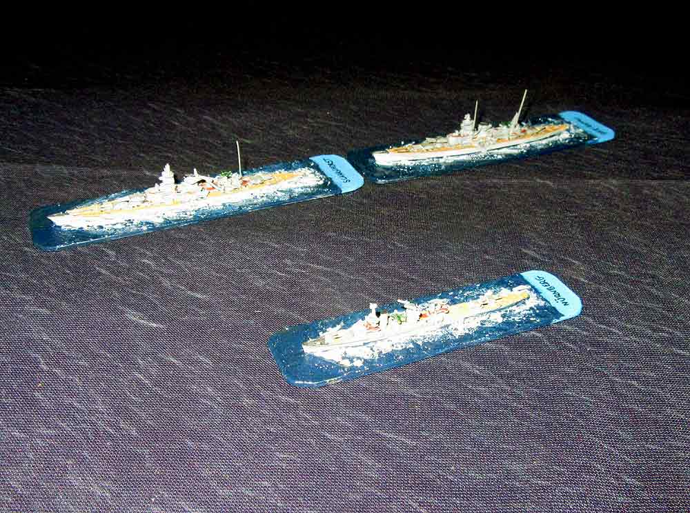 I actually didn’t have these three – or Repulse or Nürnberg, but as I planned to repaint my nametags grey rather than light blue, I didn’t mind renaming the model bases for the occasion. One of the quirks of Nimitz is that gun ranges seem crazily short – long range for guns of 8″ or more is just 24″ (60cm). As a result, the game scale looked out of odds with the size of my 1/2400 scale ships. So, that was something of a mental hurdle. Still, on we went.