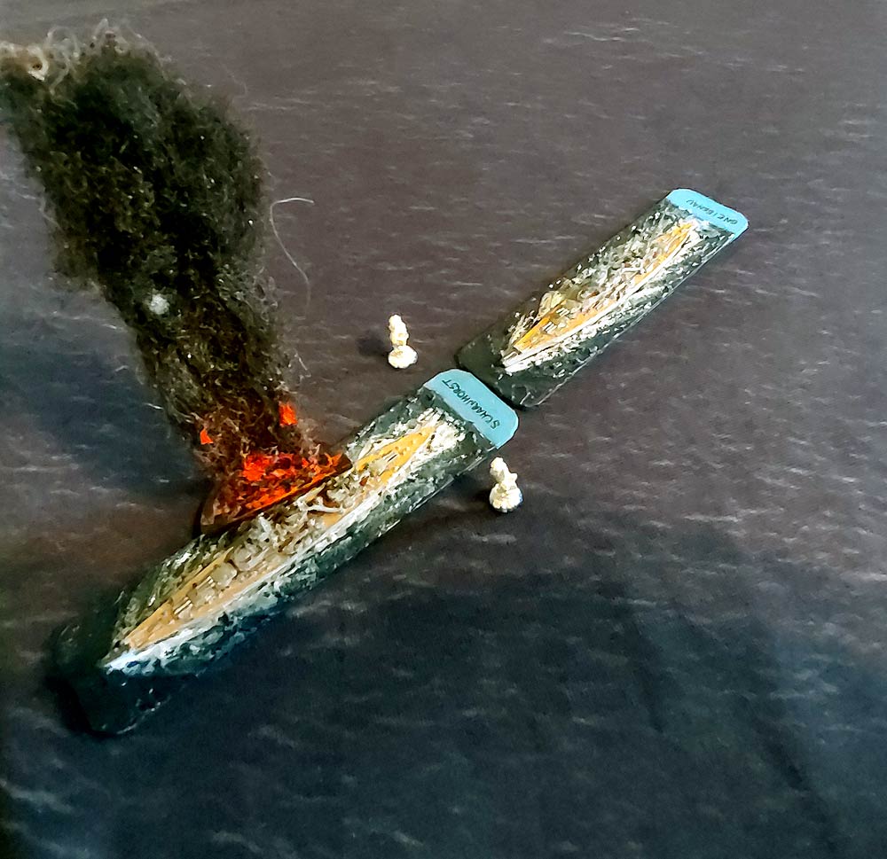 When it came it was rolled by Nick. A close-range salvo from Repulse struck Scharnhorst, and when damage was rolled for on two D6s, Nick scored a double six. That meant a magazine explosion, if the shell penetrated – which it did. So, Scharnhorst blew up, much to the surprise of everyone, as until then Nick’s die-rolling hadn’t been great. In return, Gneisenau caused some relatively light damage to Repulse, but not enough to make a real difference.