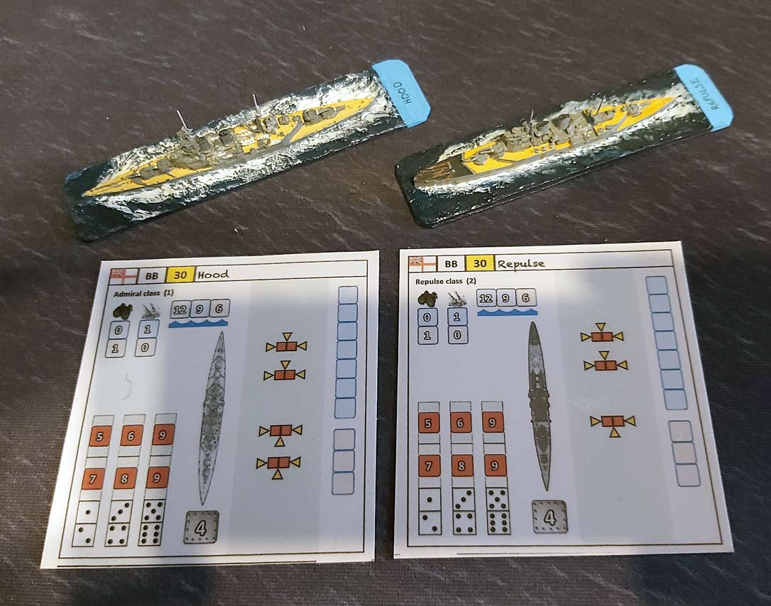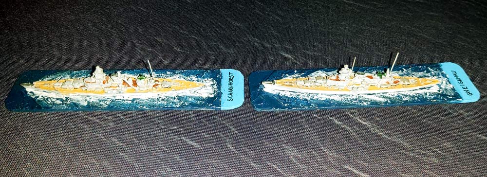 The Nimitz rules are accompanied by a useful website, which includes an introductory scenario, Operation Freya, which is set in the Norwegian campaign of April 1940. It’s an encounter battle, where the GErman battleships Scharnhorst and Gneisenau encounter the British battlecruisers Hood and Repulse, somewhere off the Norwegian coast. The Germans are accompanied by the light cruiser Nürnberg and the British by three O/P-class destroyers.