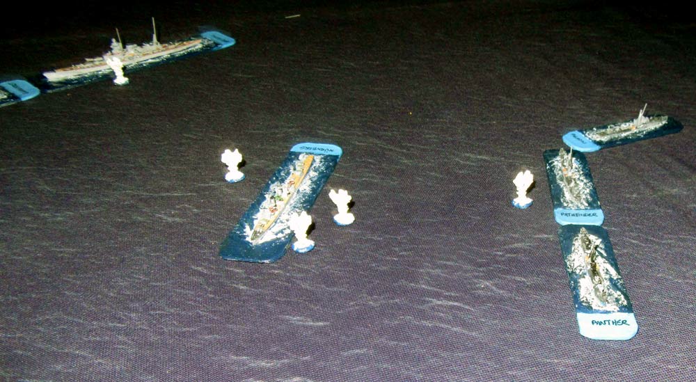 For the record, we set this off the island of Frøya, which is at the mouth of the Trondheimjford. It seemed as likely a place as any for the battle. In our game, the Germans (commanded by Nick) appeared on the northern long table edge, while the British appeared on the southern one. Sean commanded the two battlecruisers, while I ran the destroyers – Paladin, Pathfinder and Panther.