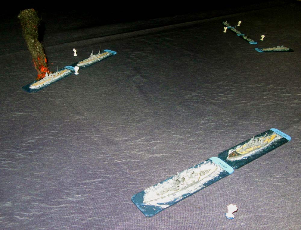 My destroyers flunked a torpedo attack on Gneisenau, as I messed up the angle, but Nürnberg pumped shells into Panther, my tail-end destroyer, and crippled her. However, Hood was hit by 11-inch salvos the German battleships, while a salvo from the old battlecruiser damaged Scharnhorst, and started a fire aboard her. The ranges were closing fast though, and with all that firepower on both sides, one good lucky hit could easily change everything.
